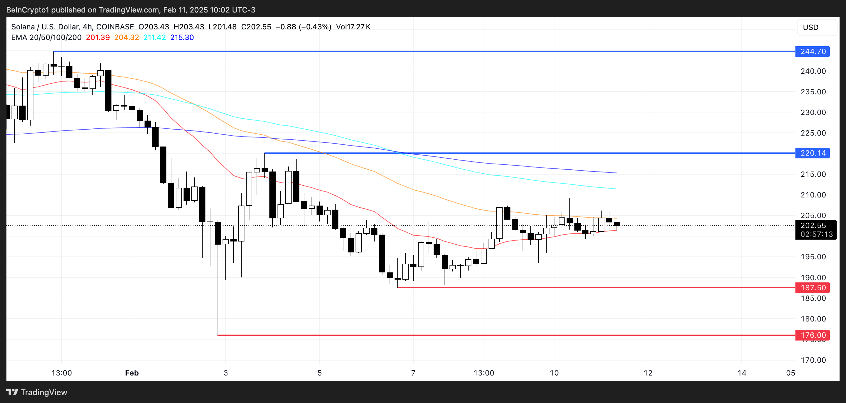 При этом на графике ниже видно, что линии EMA сужаются — это указывает на ослабление импульса и отсутствие четкого направления тренда. Если доминирующим окажется бычий импульс, то цена $SOL может повторно протестировать уровень сопротивления $220. Успешный пробой этого барьера расчистит дорогу к дальнейшему росту — вероятно, курс сможет дойти до $244. Это самый высокий уровень с конца января.