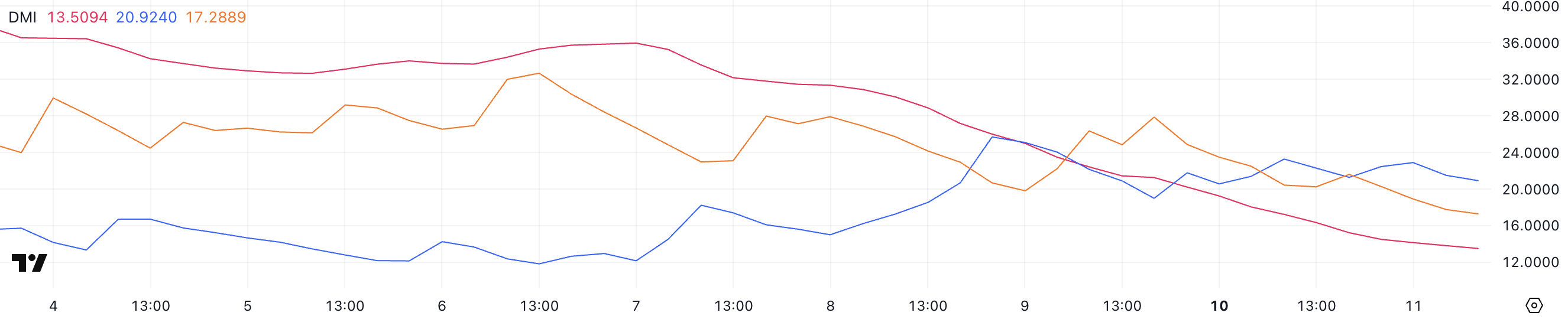 Тем временем на графике DMI видно, что ADX (средний индекс направления) за последние три дня резко снизился — с 31,5 до 13,5. Этот индекс измеряет силу тренда: значения ниже 20 указывают на то, что тренд очень слаб или отсутствует вообще.