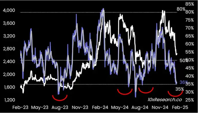 В 10x Research рассказали, что показатель RSI опустился до 36%. При предыдущих просадках, в августе 2023 года, мае и августе 2024 года, за этим следовал отскок цены второй по капитализации криптовалюты.