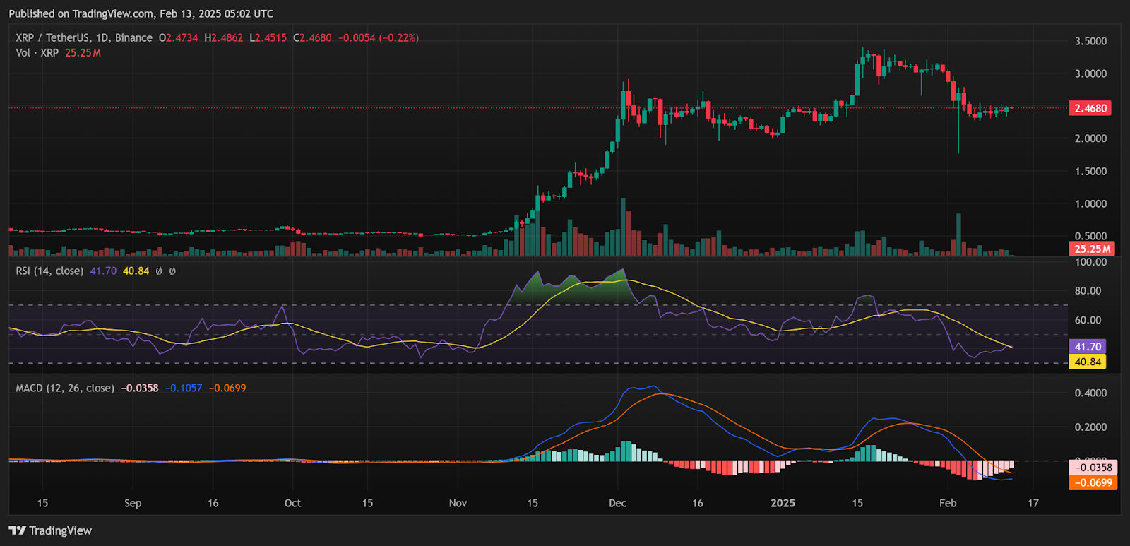 Индекс относительной силы (RSI) в настоящее время составляет около 41,70, помещая XRP в нейтральную зону и довольно далеко от условий перекупленности или перепроданности. Если давление покупателей значительно возрастет, RSI может подняться до 50-60, потенциально поддерживая бычий прорыв.