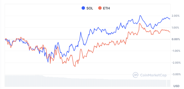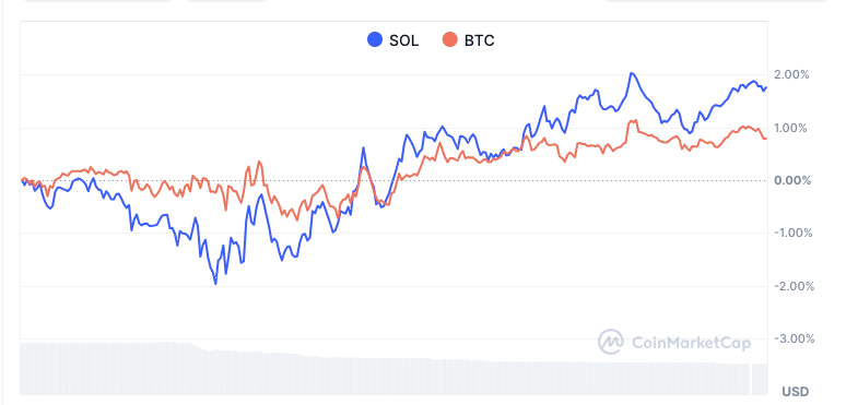 Волатильность Solana остается выше, чем у BTC, но при этом она превзошла ведущую криптовалюту по процентному росту. В то время как BTC сохраняет более устойчивый рост, колебания цен SOL способствуют более сильному общему росту. За определенный период SOL подскочил почти до 2,00%, тогда как BTC остался около 1,00%.