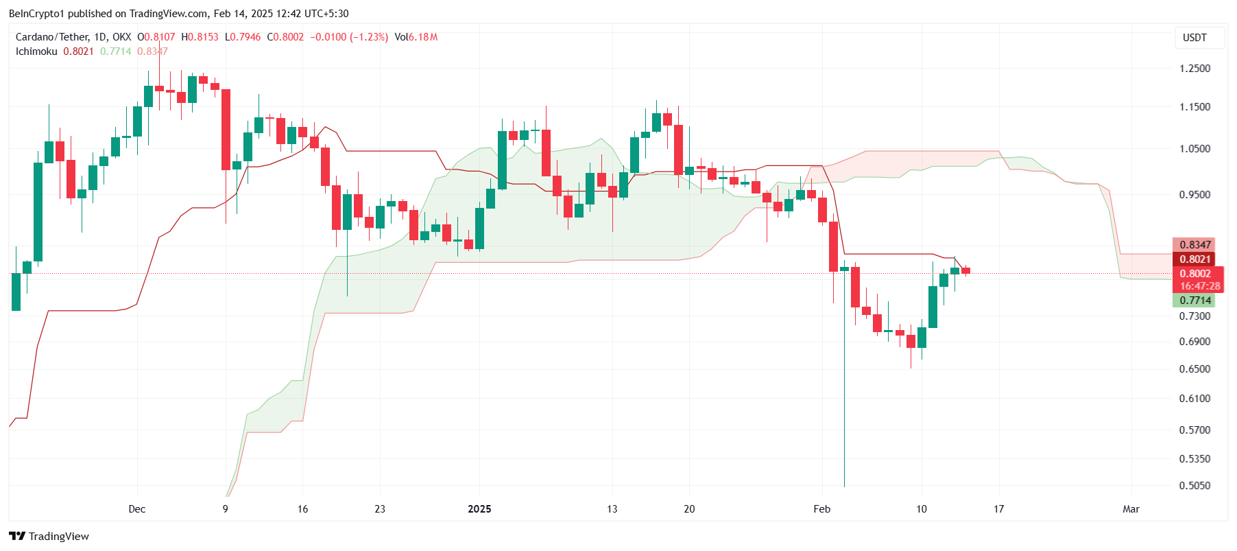 Активность крупных инвесторов может поддержать цену ADA, если рыночные условия будут благоприятными. Однако технические индикаторы, в частности облако Ишимоку, указывают на сохранение медвежьего тренда.
