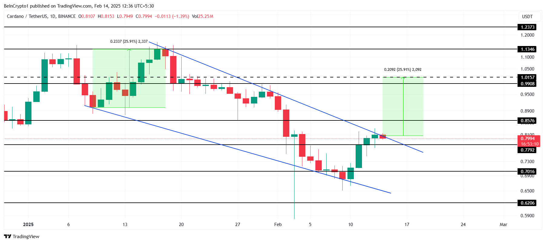 Cardano выходит из нисходящего клина, что технически указывает на возможный рост на 26%. Сейчас ADA торгуется по $0,79, и для подтверждения разворота токену необходимо закрепиться выше $0,85.