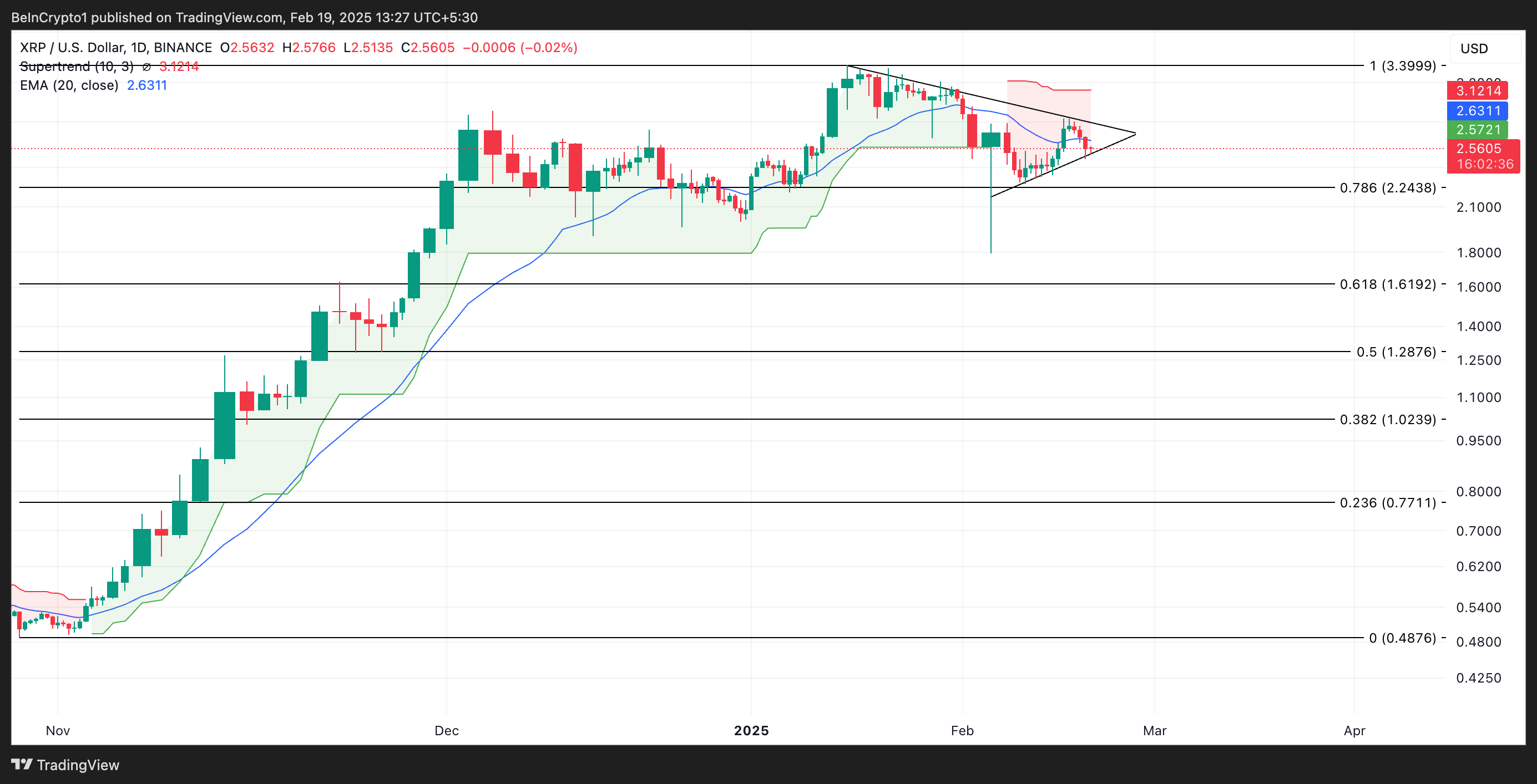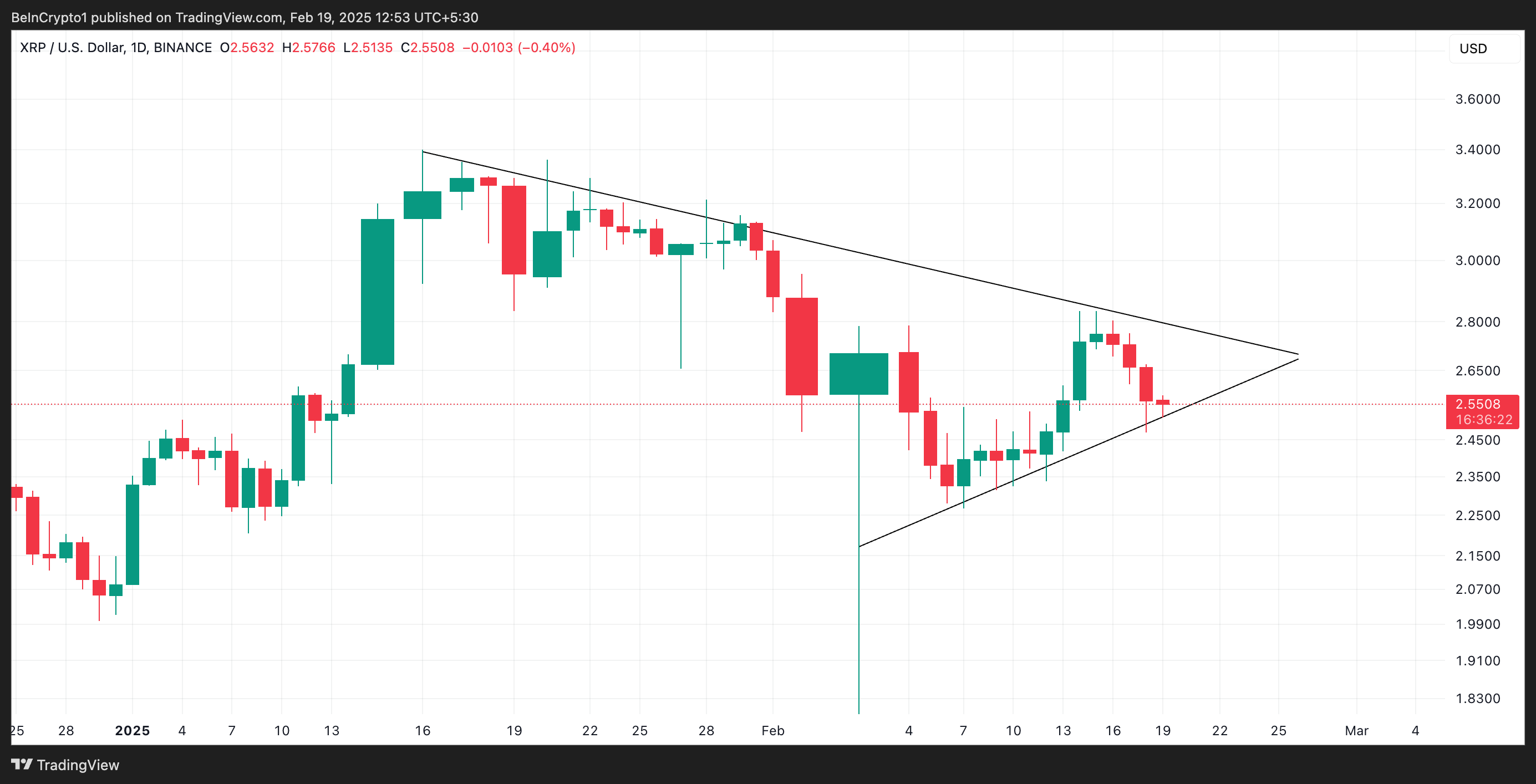 На графике ниже видно, что с 16 января (с момента достижения ATH на $3,39) XRP торгуется в рамках паттерна «симметричный треугольник». Он формируется, когда цена актива движется между двумя сходящимися линиями тренда, указывая на период консолидации и снижения волатильности.
