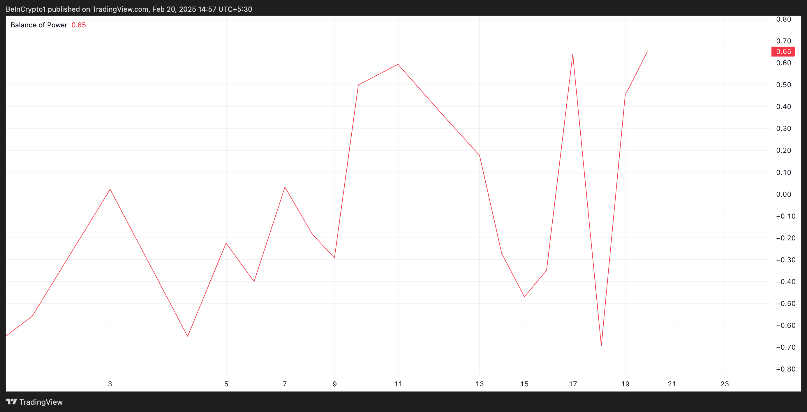 Индикатор Balance of Power (BoP) тоже подтверждает растущий оптимизм. На момент написания он составляет 0,65. Этот индикатор оценивает силу покупателей по сравнению с продавцами. Положительное значение BoP указывает на то, что покупательское давление превышает давление продаж. Это может свидетельствовать об усилении контроля быков над рынком.