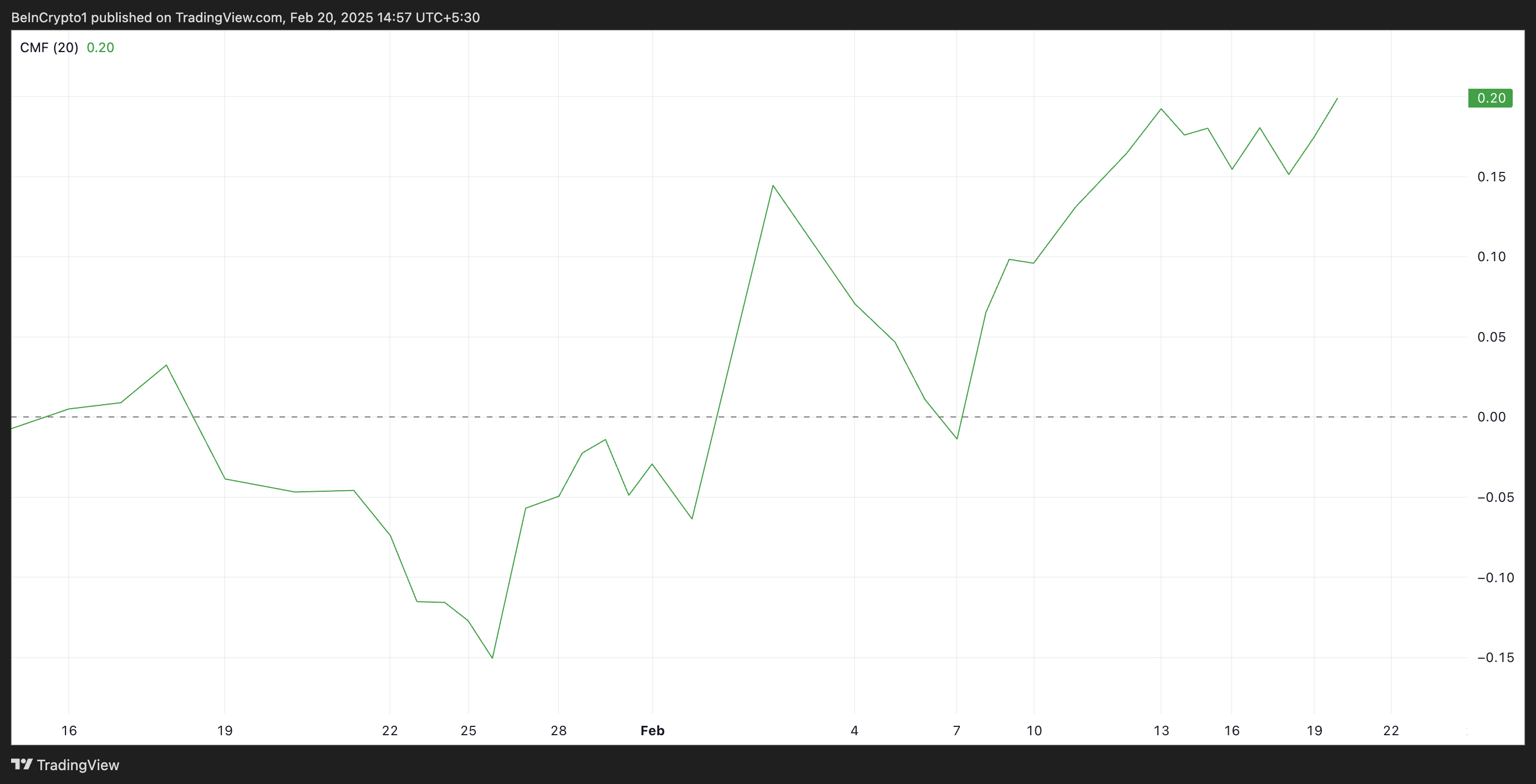 Один из таких показателей — индикатор денежных потоков Чайкина Chaikin Money Flow (CMF). Он сохраняет восходящий тренд, несмотря на консолидацию цены. На момент написания он находится выше нулевой линии на уровне 0,20.