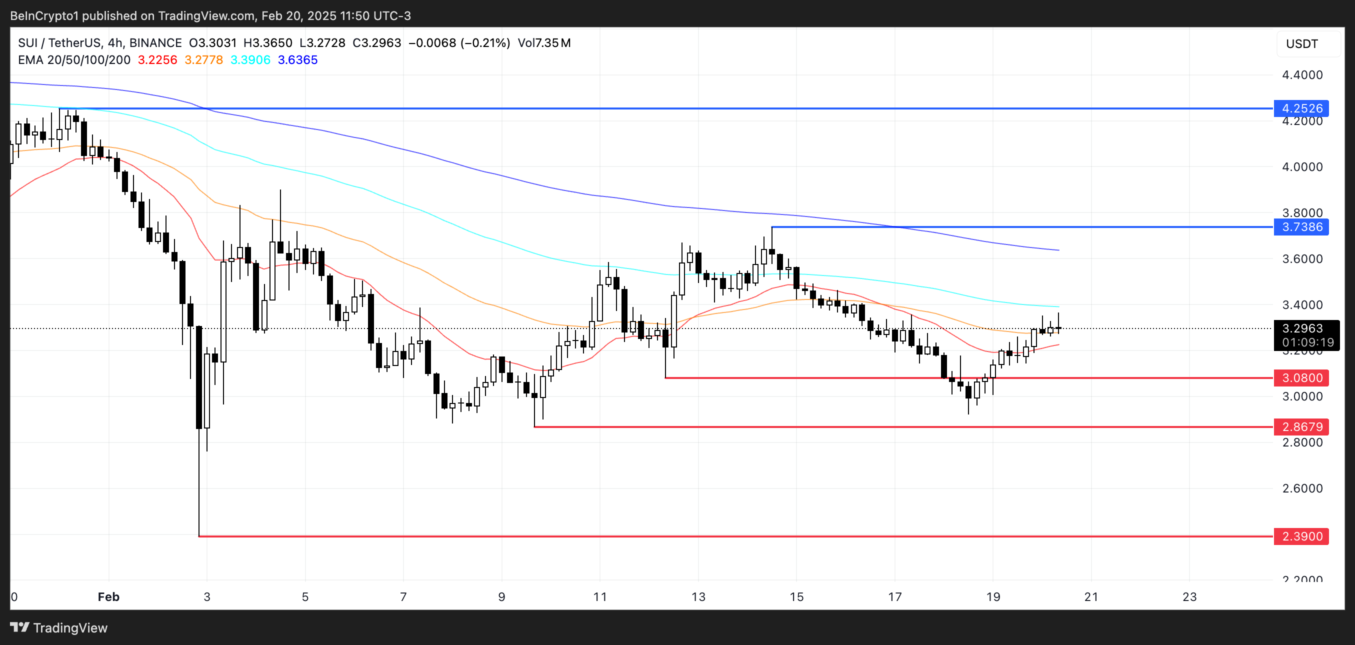 При этом на графике ниже видно, что краткосрочные линии EMA располагаются ниже долгосрочных. Такая конфигурация указывает на медвежий тренд и контроль продавцов над рынком. Если краткосрочные EMA пересекут долгосрочные, образуя золотой крест, SUI может протестировать сопротивление на уровне $3,73.