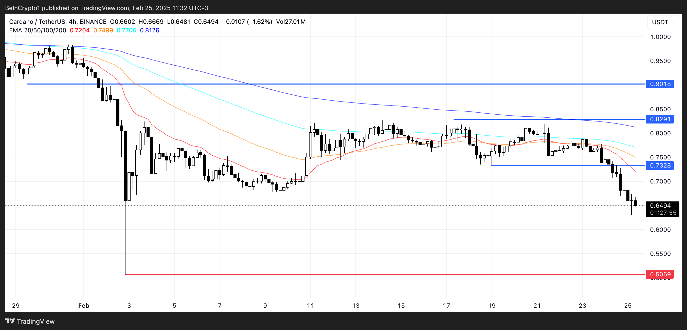 Если восходящий тренд сохранится, ADA потенциально может вырасти на 40% и достичь 0,90 доллара. Чтобы произошёл такой разворот, краткосрочные скользящие средние должны пересечь долгосрочные, сигнализируя о переходе от медвежьего настроя к бычьему.