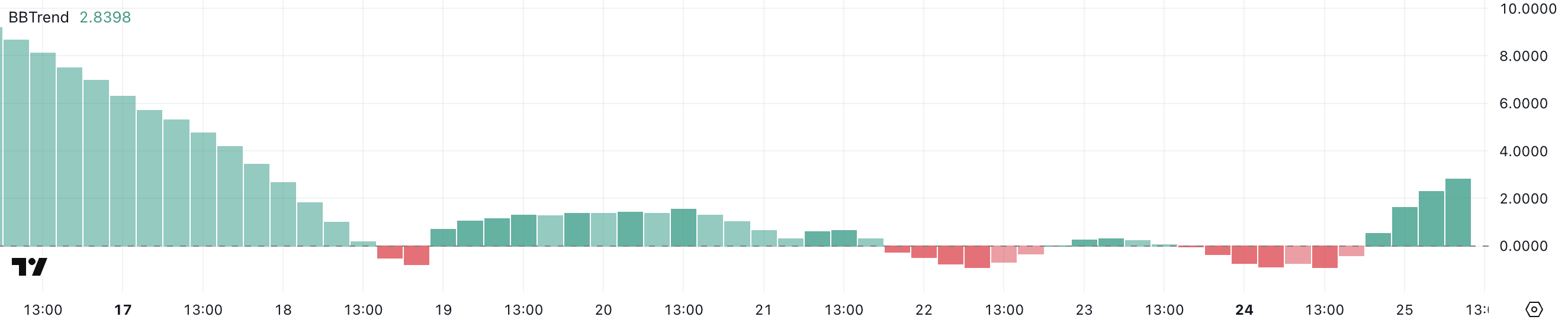 BBTrend для ADA в настоящее время составляет 2,83, что выше значения -0,90, зафиксированного всего день назад, и указывает на изменение динамики. BBTrend — это индикатор, созданный на основе полос Боллинджера, который измеряет силу и направление тренда.