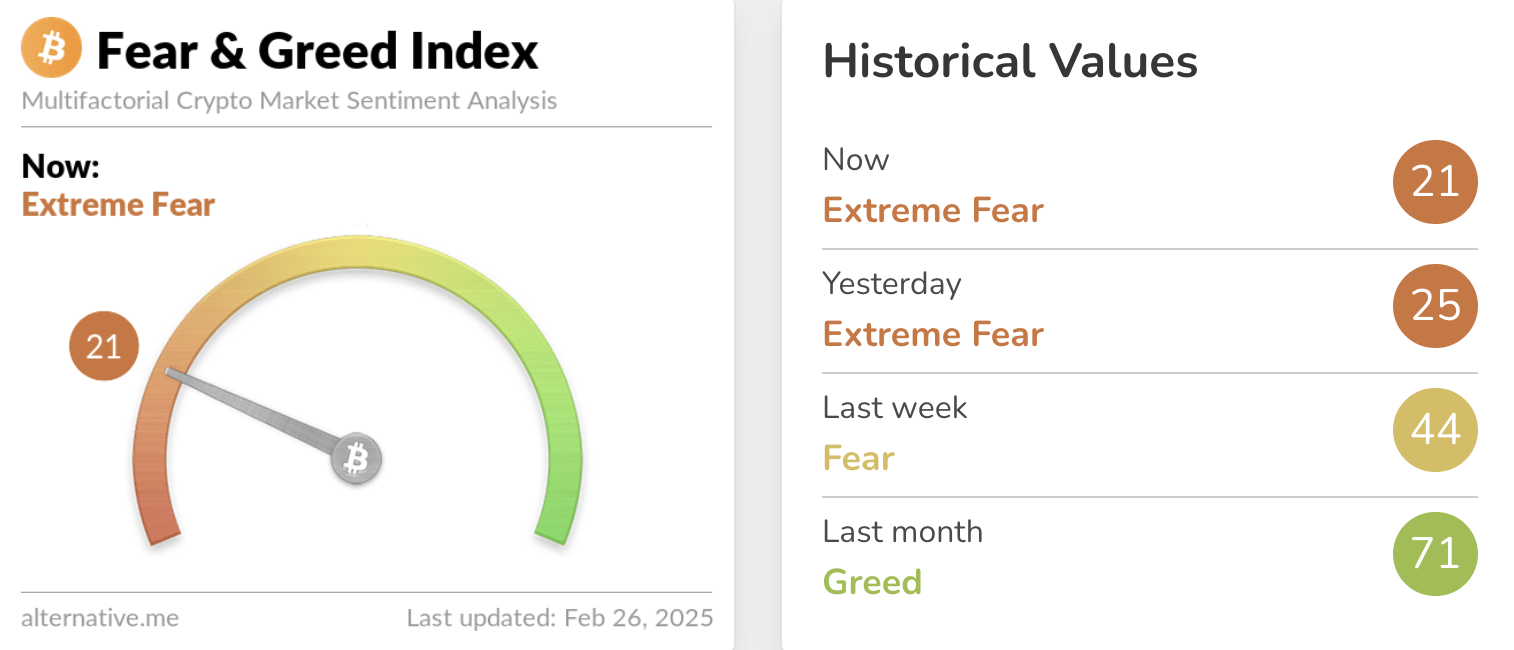 Сейчас настроения на рынке далеки от оптимизма. Индекс страха и жадности (Crypto Fear & Greed Index) 26 февраля опустился до 21 из 100, что соответствует уровню «экстремального страха».