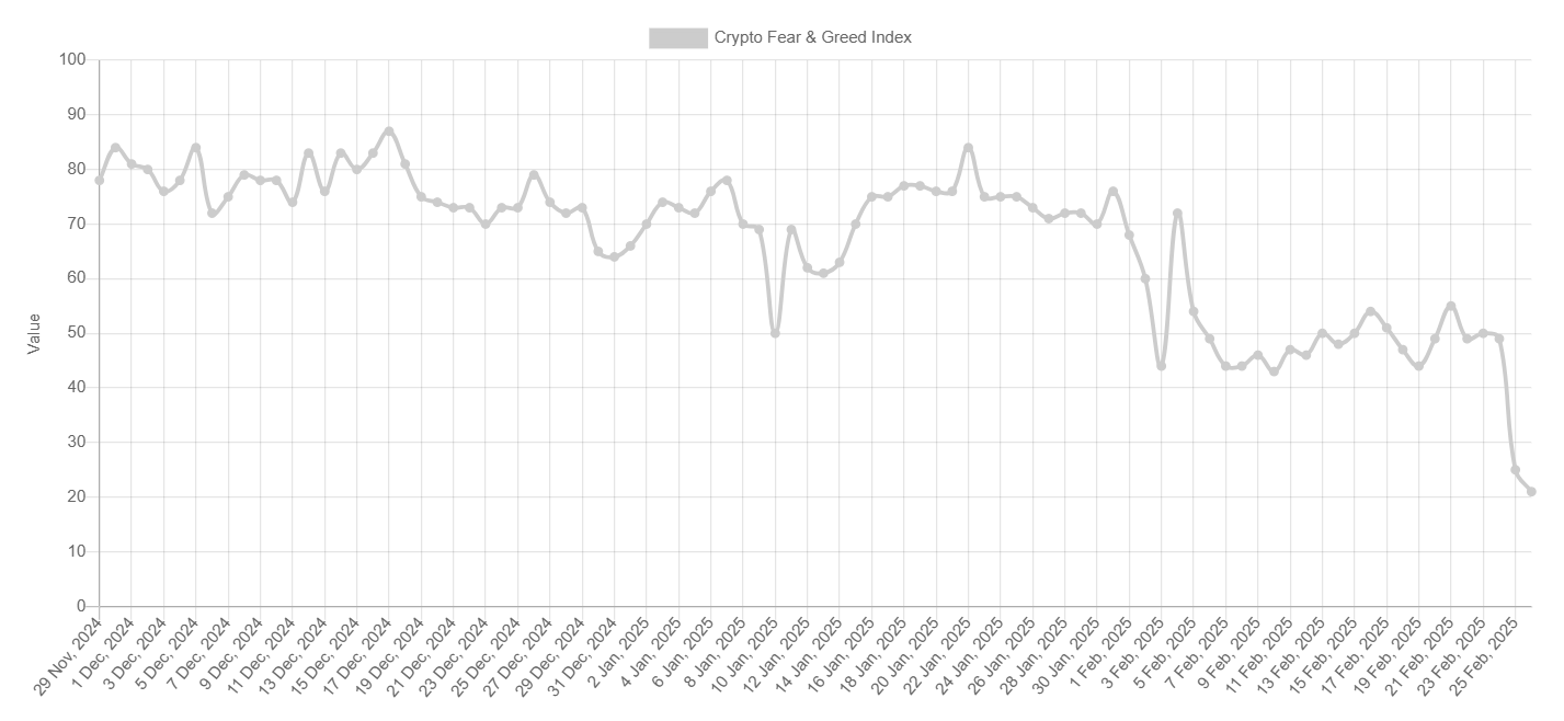 Криптовалютный индекс страха и жадности опустился до отметки 21, что сигнализирует об «экстремальном страхе». Это рекордно низкий показатель с августа 2024 года.