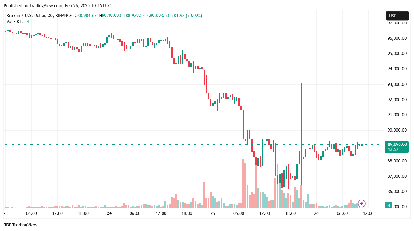 На момент написания биткоин торгуется на уровне $89 000, впервые провалив $90 000 c ноября 2024 года. Капитализация составляет $1,77 трлн.