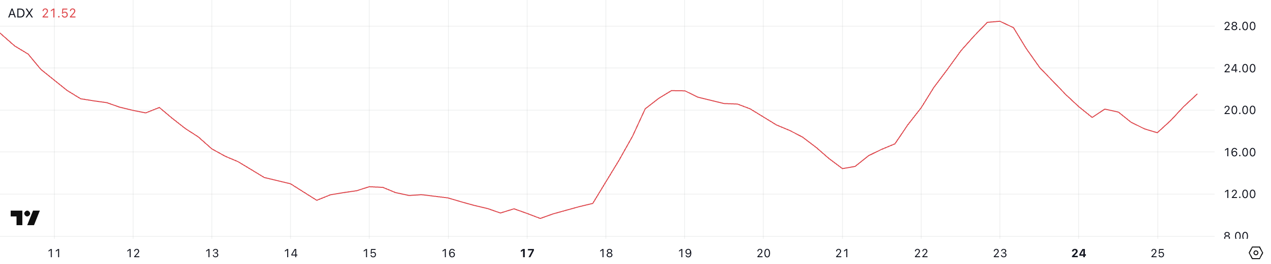 Два дня назад средний индекс направления (ADX) для HMSTR составлял 28,4, 25 февраля он опустился до 18,8, а к моменту написания скорректировался до 21,5.
