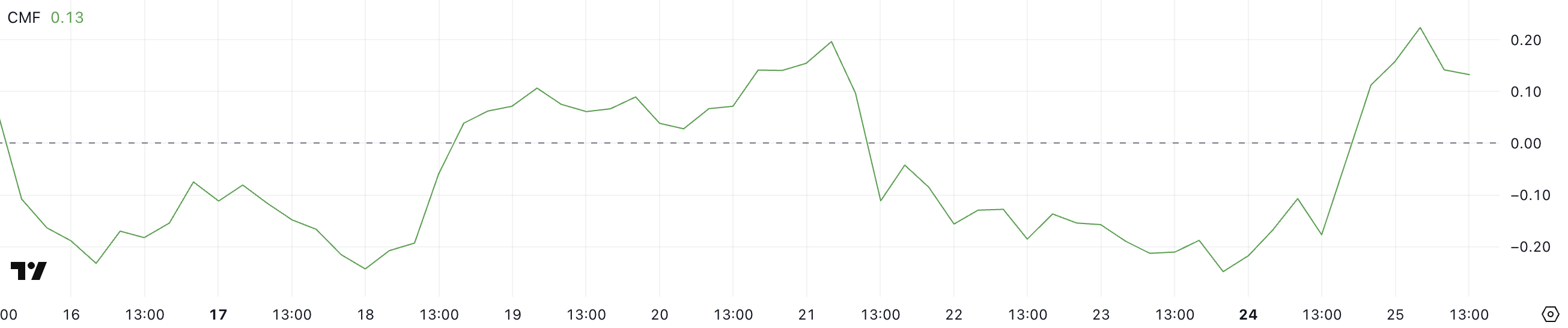 Индикатор денежного потока Чайкина (CMF) для токена Hamster Kombat сейчас составляет 0,13. Два дня назад показатель составлял -0,25, а вчера, 25 февраля, достиг пика на 0,22.
