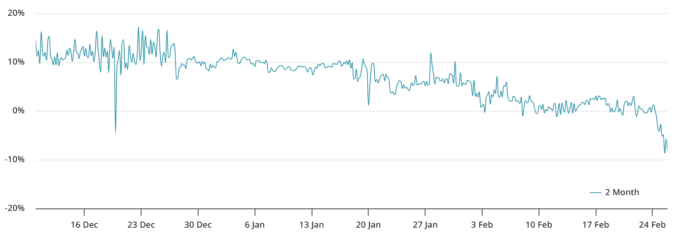 Часто месячные фьючерсы торгуются дороже чем спотовая цена, так как их расчёт происходит позже. В бычьем рынке эта разница может достигать 5–10%. Однако 24 февраля цена фьючерсов SOL оказалась ниже спотовой. Это указывает на рост спроса на шортовые позиции.