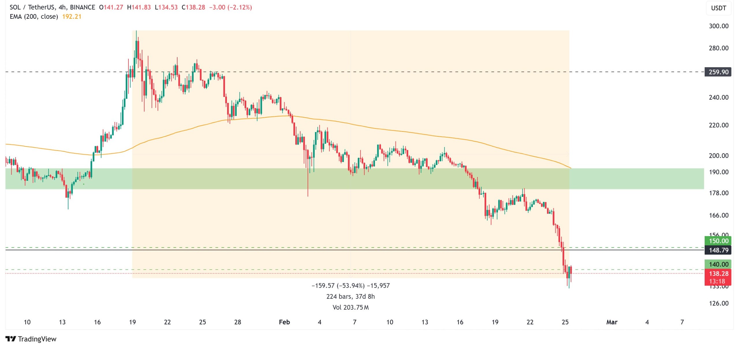 Цена Solana (SOL) упала до $140,43, потеряв 50% с момента исторического максимума в $295, установленного 19 января. В феврале цена просела на 42%, что стало крупнейшим месячным падением с ноября 2022 года, когда рухнула биржа FTX.