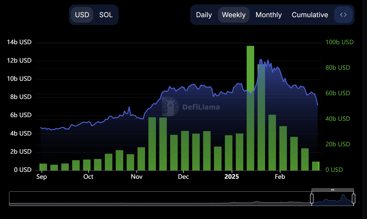 Это ударило по всей сети. Если в январе общий ончейн-объём Solana доходил до $97 млрд в неделю, то сейчас он упал до $7 млрд.