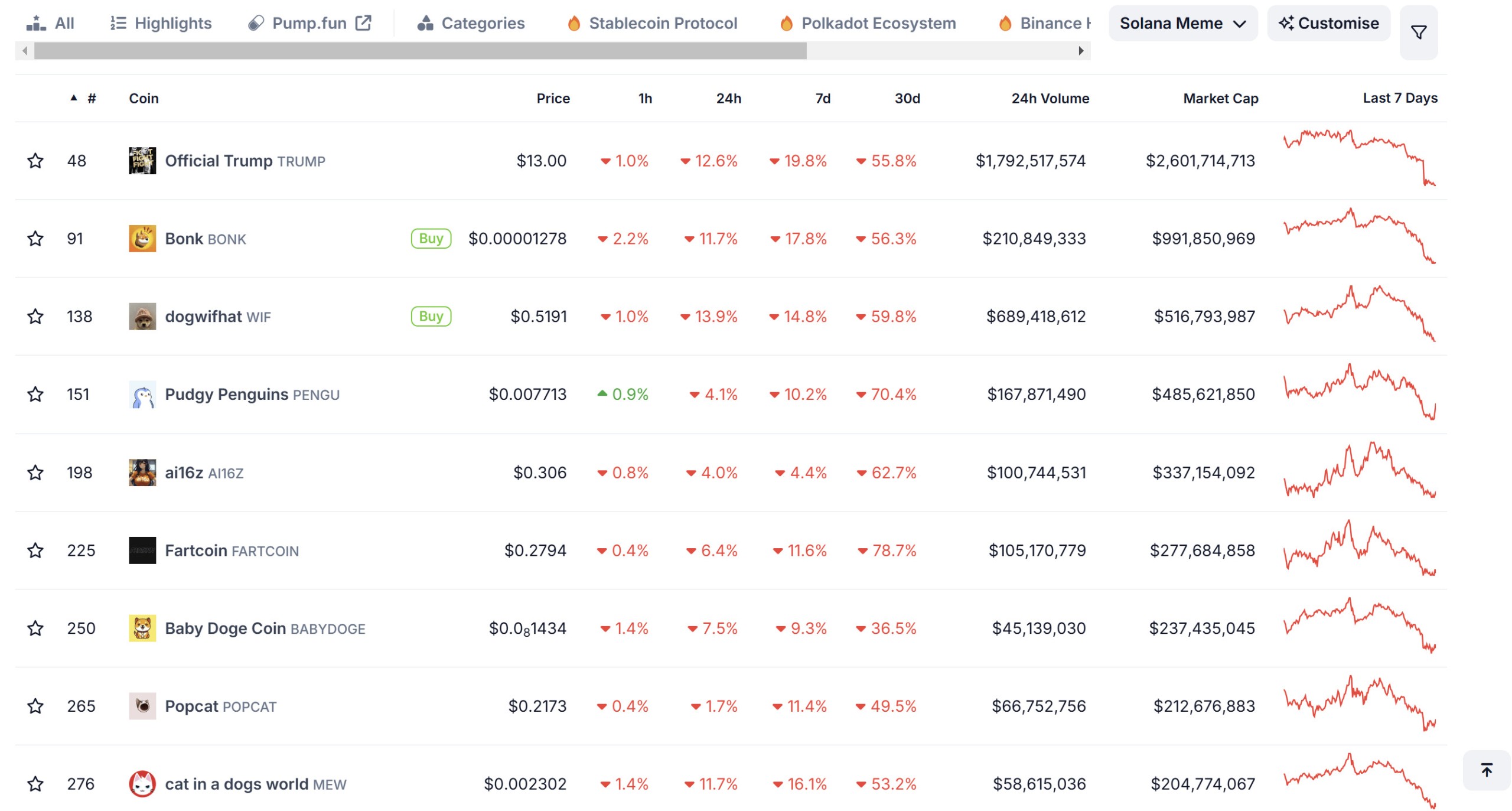 В декабре 2024 года общая капитализация мемкоинов на Solana достигала $25 млрд, но с тех пор снизилась до $8,3 млрд. Только за последние 24 часа рынок потерял ещё 23%.