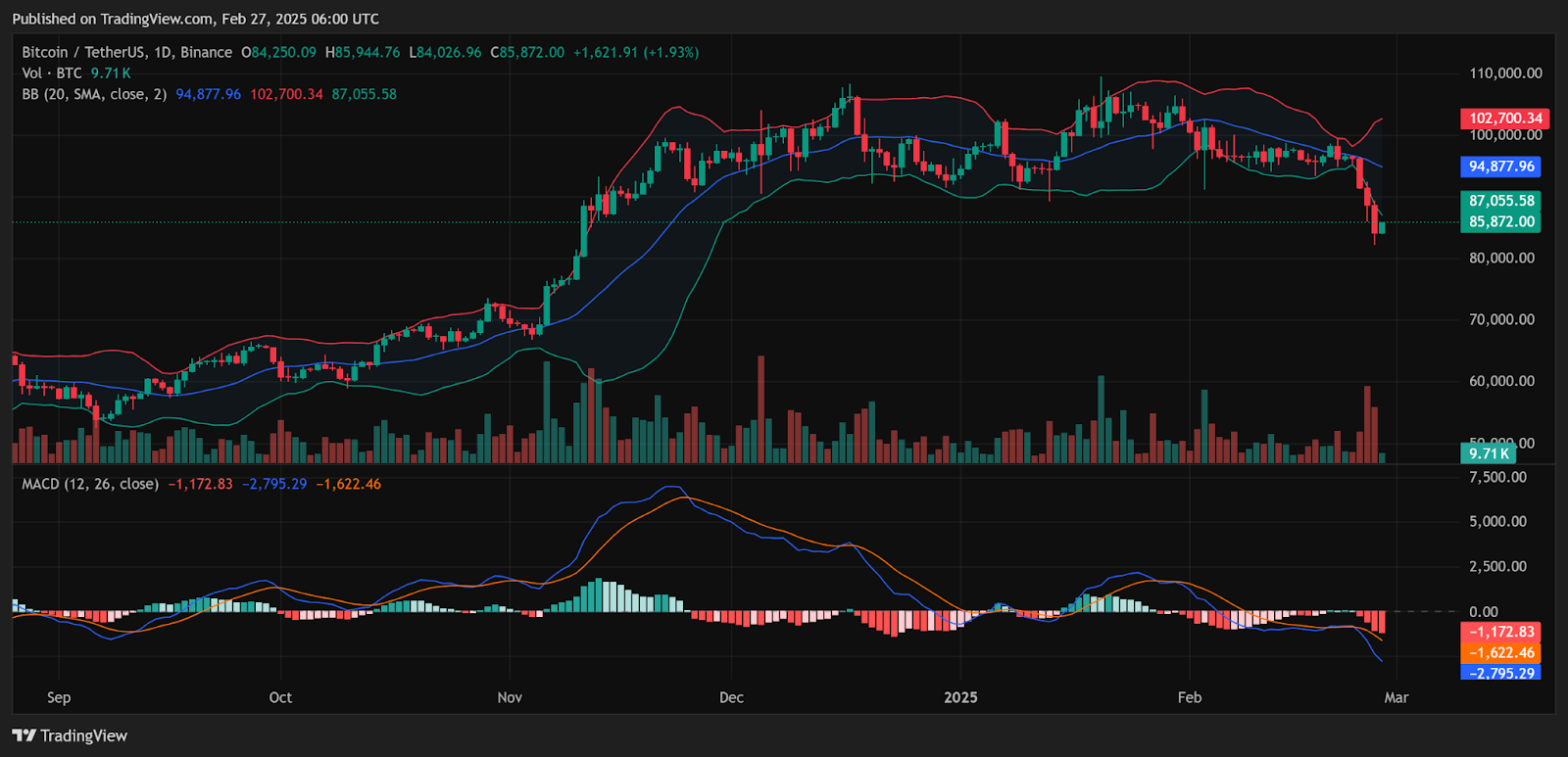 Глядя на дневной график TradingView ниже, Биткойн недавно прорвался ниже средней полосы Боллинджера, демонстрируя большее давление со стороны продавцов.