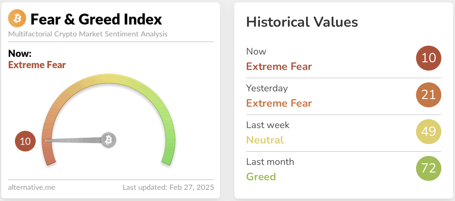 27 февраля 2025 года индекс страха и жадности обвалился до 10 пунктов, что указывает на «экстремальный страх» криптотрейдеров. Это минимальное значение с июля 2022 года.