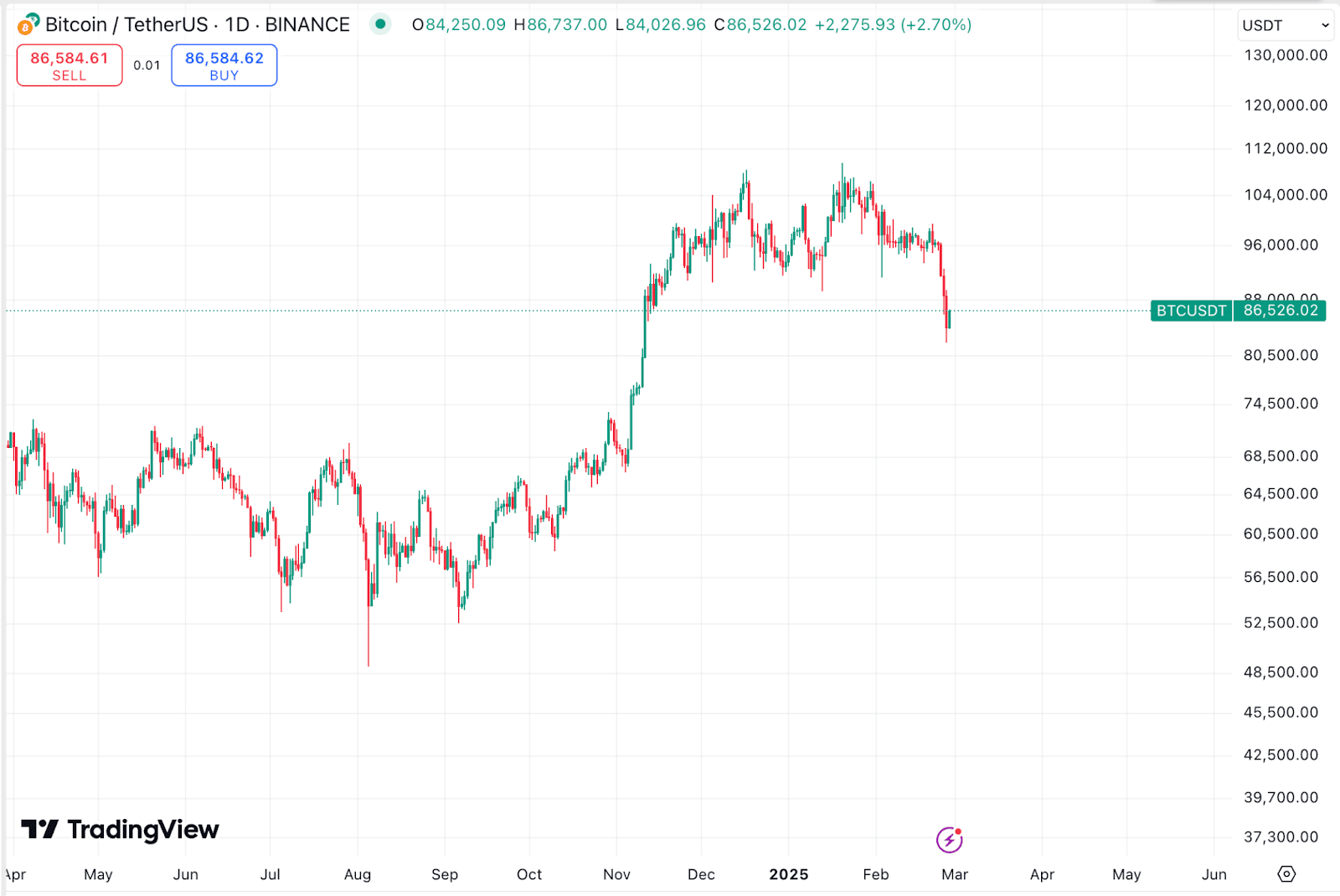 Напомним, что в ночь на 27 февраля цена биткоина опускалась до $82 000. За неделю она упала почти на 11%, согласно данным CoinMarketCap.