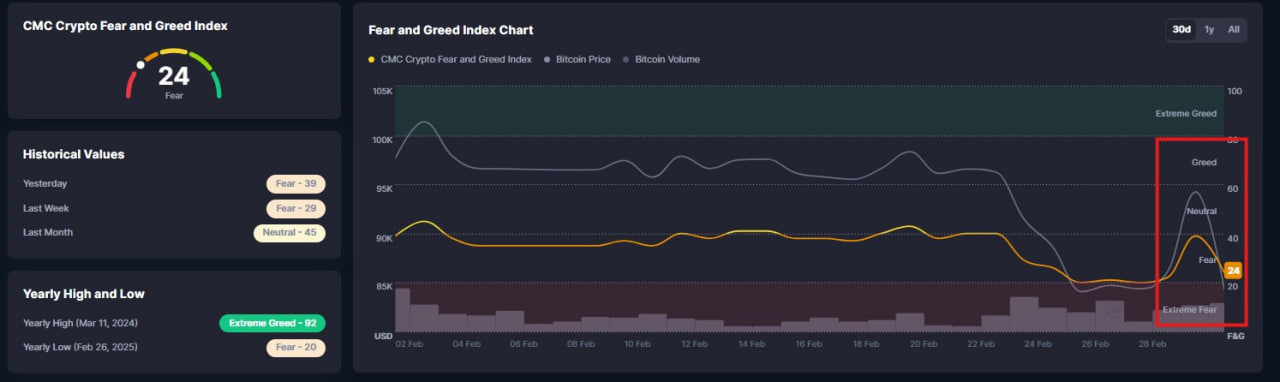 Индекс страха и жадности испытал резкие скачки. Перед новостью он находился в зоне «экстремального страха» (20 баллов), после объявления взлетел до 55 («жадность»), а теперь вернулся на 24 («страх»).