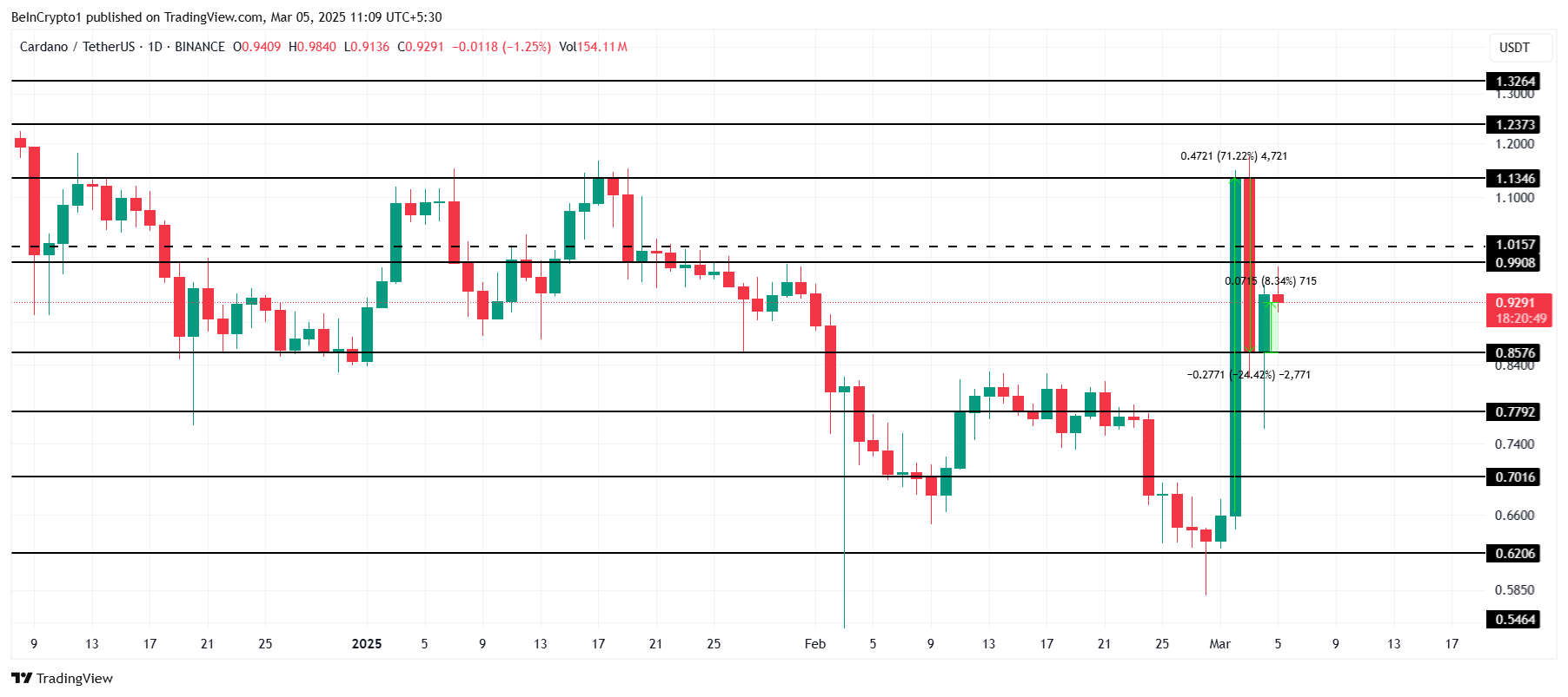 На момент написания этого анализа ADA торгуется по $0,9556. Прирост токена за последние сутки составил 18,6%.