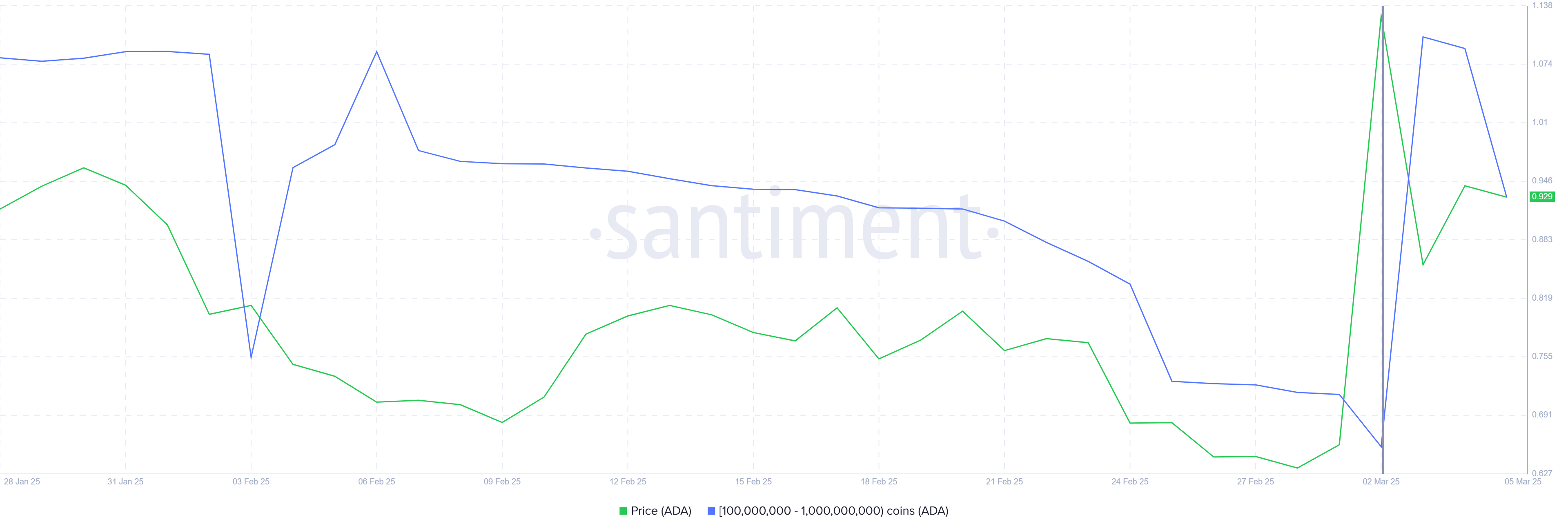 За последние сутки инвесторы, владеющие от 100 млн до 1 млрд ADA, продали около 160 млн токенов на сумму $147 млн. Это давление на продажу возникло на фоне падения цены Cardano за последние два дня.