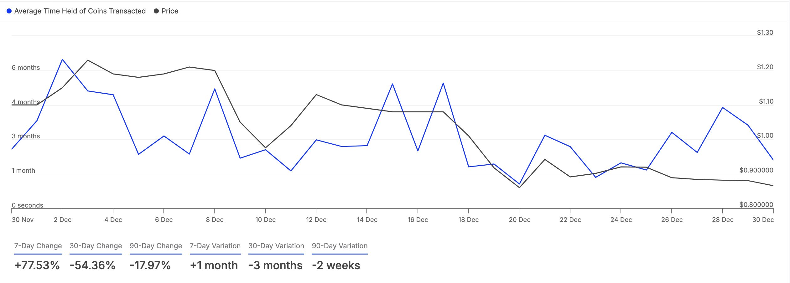 Ончейн-данные показывают, что в последнюю неделю инвесторы стали дольше удерживать ADA. Это свидетельствует о переходе к долгосрочным стратегиям, а не к быстрой торговле ради прибыли. По данным IntoTheBlock, среднее время удержания ADA за последние семь дней увеличилось на 78%.