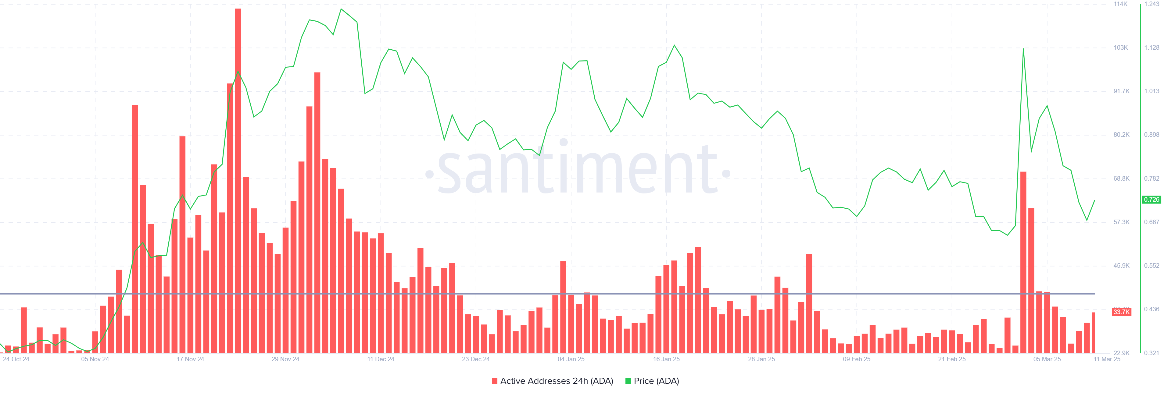 В начале месяца, когда цена ADA ненадолго выросла, число активных адресов резко увеличилось. Однако, когда этот импульс не удалось удержать, возникли сомнения. С уменьшением активности инвесторов, альткоин может столкнуться с новыми трудностями, если интерес к нему продолжит падать.