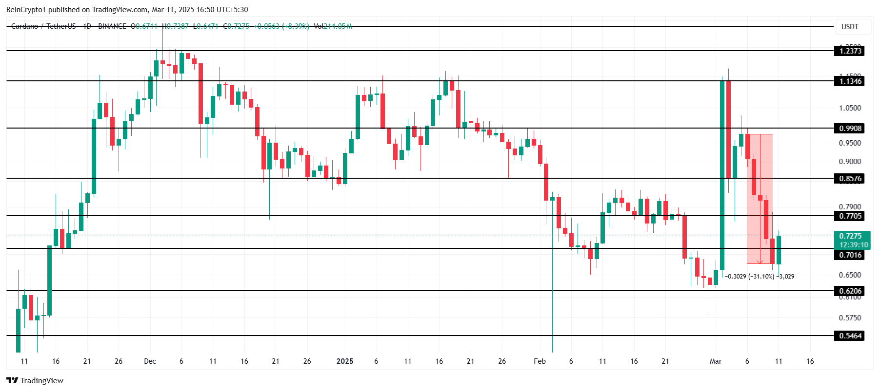 По мере того как ADA удаляется от отметки $1,00, она продолжает испытывать трудности с доверием инвесторов и в условиях общего рыночного давления. В ближайшее время Cardano, вероятно, будет колебаться выше $0,70. Впрочем, падение до $0,62 все еще возможно, особенно если настроения инвесторов останутся негативными.