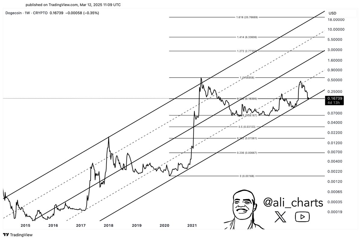 Мартинес заявил в посте на X (ранее Twitter), что если поддержка на уровне $0,16 упадет, Dogecoin может упасть до $0,09. Но он также видит в этом потенциальную возможность покупки.