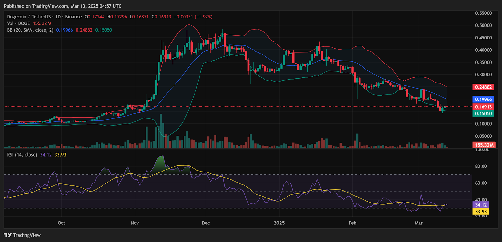 Индекс относительной силы (RSI) Dogecoin ($DOGE) составляет 34, что указывает на то, что актив находится вблизи зоны перепроданности.