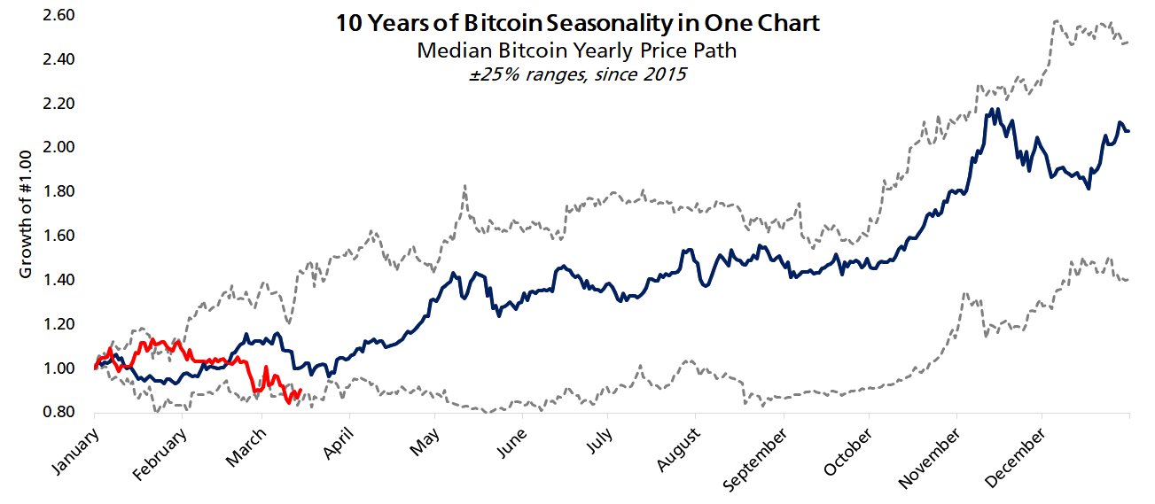 «Биткоин торгуется ближе к нижней границе своего исторического сезонного диапазона», — отметил он, сопроводив свой вывод графиком, сравнивающим ценовые циклы BTC. «Почти весь годовой рост биткоина происходит в два месяца: апрель и октябрь. Вполне возможно, что биткоин достигнет нового исторического максимума до июня».