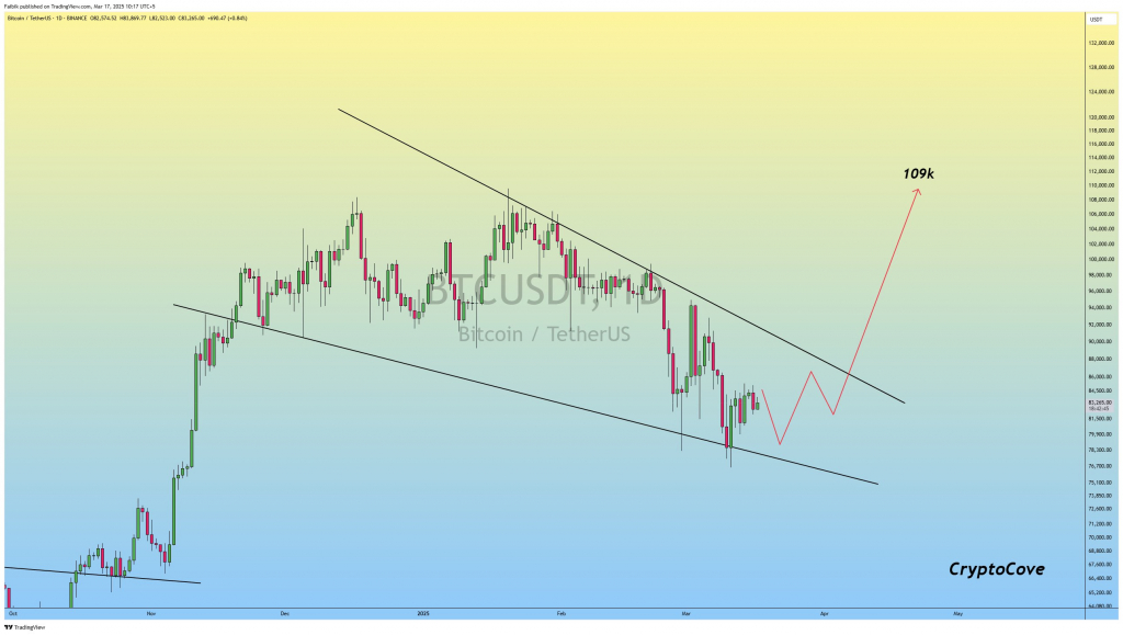 «Думаю, биткоин сначала опустится до $78 000 для захвата ликвидности, прежде чем произойдет прорыв вверх», — утверждает популярный трейдер Captain Faibik. «После прорыва биткоин, вероятно, достигнет $109 000 в ближайшие недели (возможно, к середине апреля)».