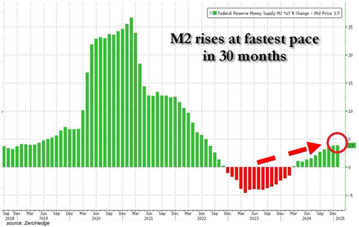 «Денежная масса M2 выросла на +3,9% в годовом исчислении в январе, самыми быстрыми темпами за 30 месяцев. Это 11-й месяц подряд расширения денежной массы», — отметил The Kobeissi Letter.