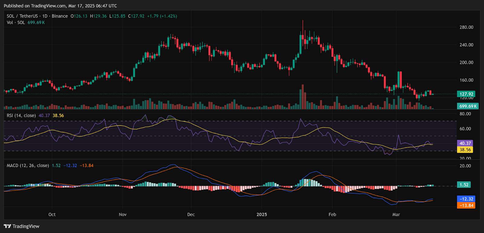 С точки зрения технического анализа, индекс относительной силы (RSI) в настоящее время составляет 40,37, приближаясь к условиям перепроданности. Вместе с тем схождение и расхождение скользящих средних (MACD) остаётся слегка бычьим, а линия MACD (синяя) торгуется ниже сигнальной линии (оранжевая).