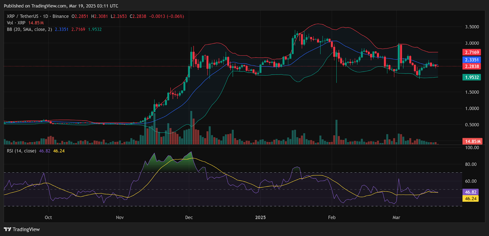 Кроме того, верхняя полоса Боллинджера в настоящее время находится на уровне $2,71, в то время как цена XRP продолжает торговаться ниже средней линии (20-дневная простая скользящая средняя) на уровне $2,33. Примечательно, что есть значительная поддержка на нижней полосе Боллинджера, на уровне $1,95.