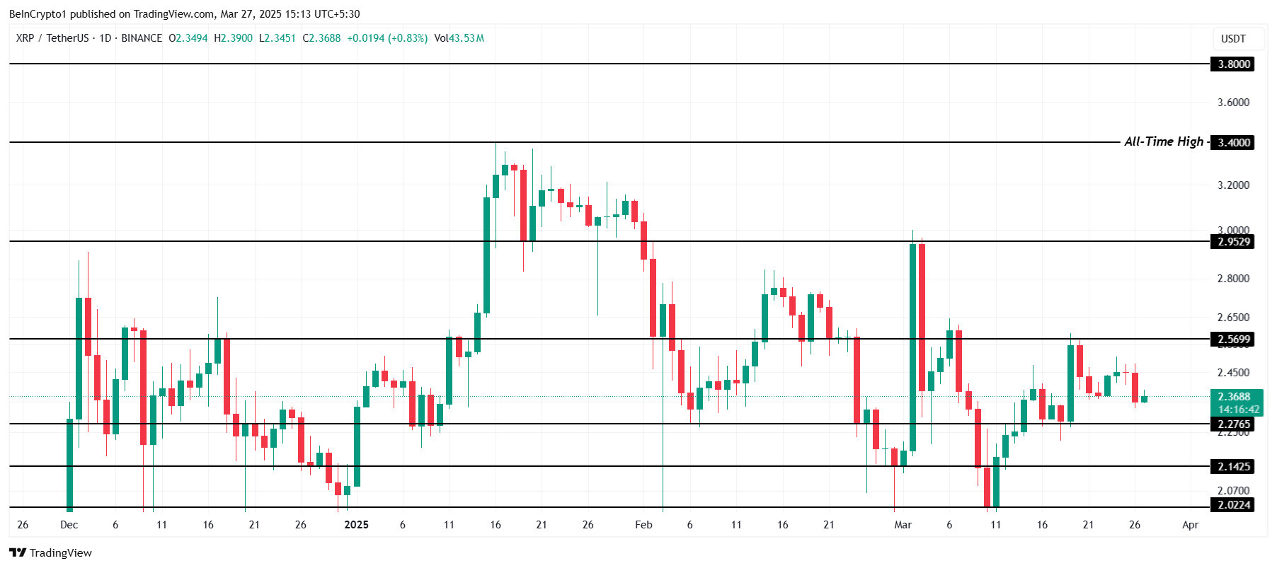 XRP не может запустить значительный рост и пробить ключевой уровень сопротивления. Несмотря на попытки восстановления, Ripple не удается достичь прогресса выше отметки $2,56