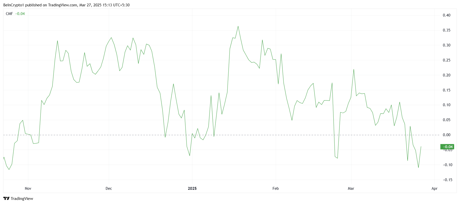 Технические индикаторы тоже отражают общее настроение на рынке. Индикатор денежных потоков Чайкина Chaikin Money Flow (CMF) упал до четырехмесячного минимума, оставаясь ниже нулевой отметки и указывая на медвежий настрой.