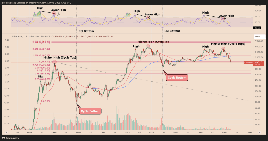 «В декабре 2024 года Ethereum достиг пика на уровне $4095, но RSI показал более низкий максимум — это совпало с началом глубокой коррекции. Сейчас цена уже опустилась ниже уровня 1,0 по Фибоначчи (примерно $1550), а недельный RSI еще держится выше 30, что оставляет пространство для дальнейшего падения», — говорится в сообщении.