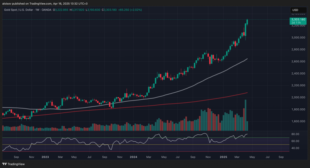 Цена на золото установила новый исторический максимум около $3,3 тыс. за унцию 16 апреля, в то время как биткоин продолжает бороться за сохранение позиций на фоне торговой войны США. Инвесторы массово переходят в золото как надежное убежище от макроэкономической нестабильности.