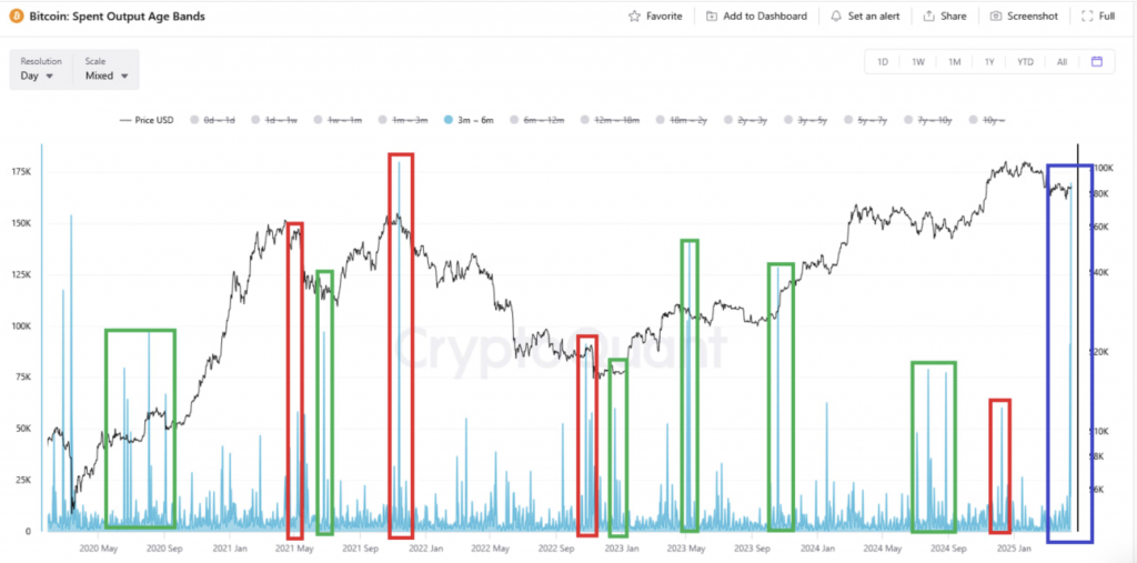 Последние данные показывают, что 170 000 биткоинов, принадлежащих инвесторам, купившим криптовалюту 3-6 месяцев назад, начали активно перемещаться по сети. «Крупные перемещения в этой группе часто сигнализируют о неизбежной значительной волатильности», — отметил аналитик CryptoQuant Mignolet.