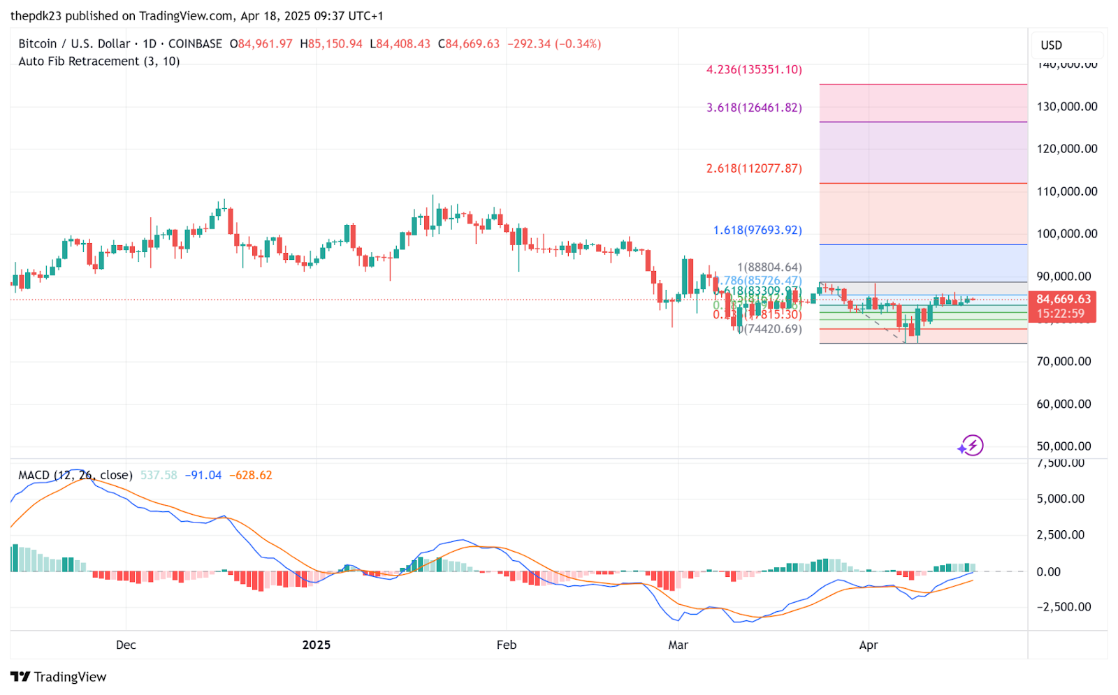 - MACD показывает бычий настрой, а уровни Фибоначчи намекают на прорыв выше $88 000 в сторону $100 000.