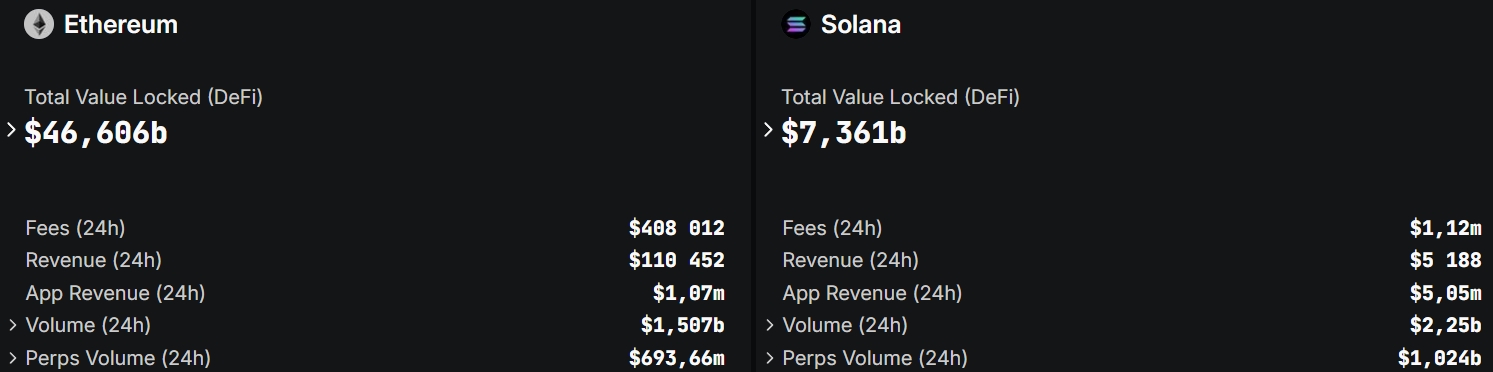 Ряд других показателей также говорит о большей популярности Solana. Доход сети Ethereum за последние 24 часа составил $110 тыс., у конкурента — $5,1 млн. Объемы торгов: $1,5 млрд и $2,2 млрд соответственно.
