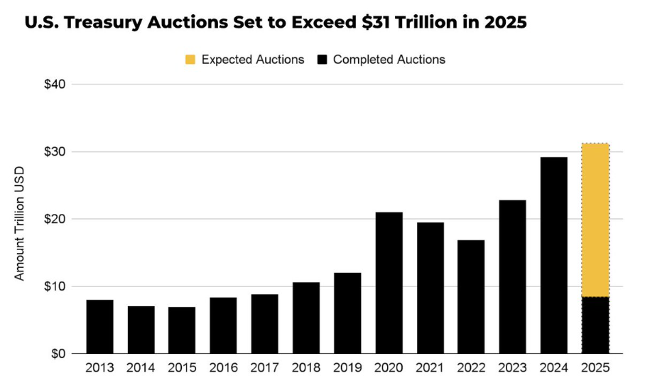 В 2025 году ожидается продажа рекордного количества казначейских облигаций, объемы которой достигнут с учетом рефинансирования $31 трлн, по оценкам аналитиков крупнейшей криптобиржи Binance. Аналитики полагают, что эта ситуация потребует от инвесторов пристального внимания из-за потенциального влияния на все торговые рынки, включая криптовалютный.