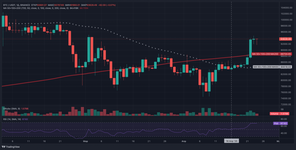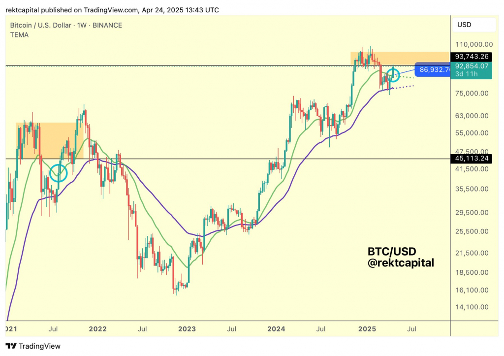 «Если биткоин продолжит повторять сценарий середины 2021 года, мы можем увидеть временное снижение до $87 000, где проходит ключевая для бычьего рынка экспоненциальная скользящая средняя. Это будет классический ретест после пробоя», — пояснил он, анализируя недельный график. «Однако многое зависит от того, сможет ли BTC закрепиться выше критического уровня $93 500 на недельном таймфрейме».