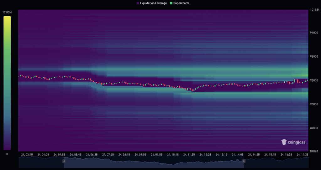Последние данные мониторингового ресурса CoinGlass показывают, что наибольшая концентрация коротких позиций с плечом для ликвидации сосредоточена около отметки $93 600 — именно того уровня, который биткоин тестирует в данный момент.