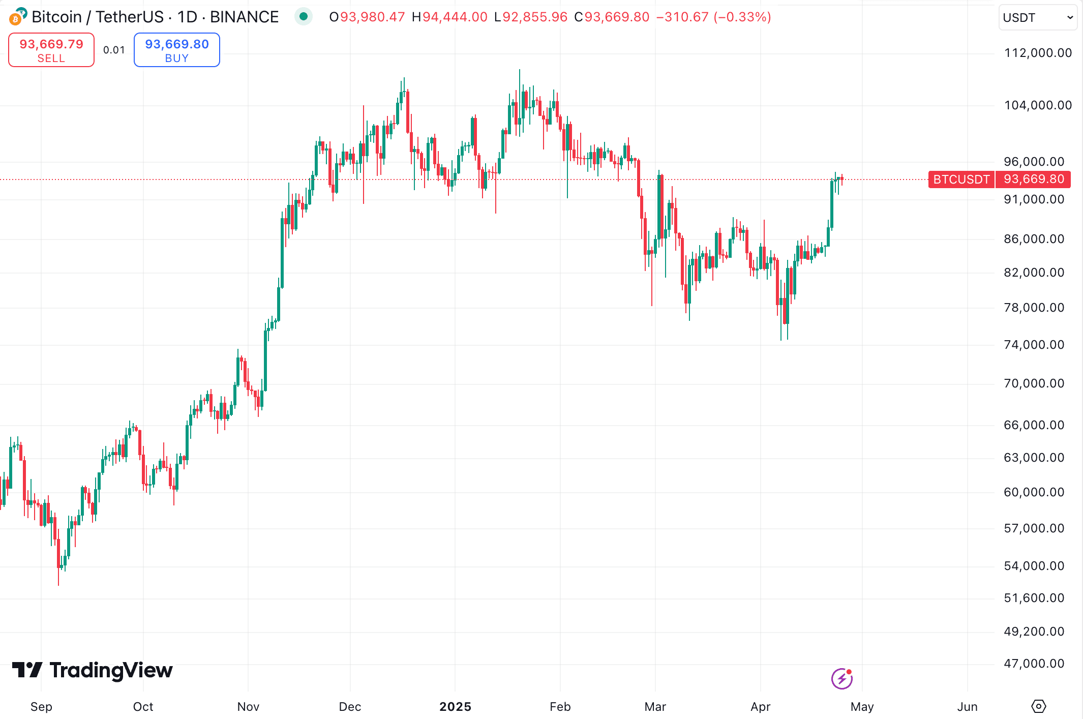 Цена криптовалюты находится на уровне $93 670, согласно TradingView на момент подготовки материала.