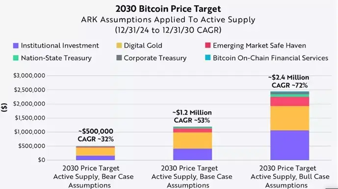 В ARK Invest назвали ориентиры для медвежьего, базового и бычьего сценариев биткоина — до $500 000, $1,2 млн и $2,4 млн соответственно. По мнению аналитиков, среднегодовые темпы роста котировок первой криптовалюты ожидаются на уровне 32%, 53% и 72%.